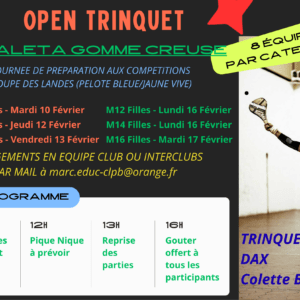 Open Trinquet – Paleta Gomme Creuse Journées de préparation – Vacances de février Dans le cadre de la préparation à la Coupe des Landes Trinquet Baline, le Comité des Landes de Pelote Basque organise des journées de préparation sous forme de tournois, destinées aux catégories Filles et Garçons M12 à M16, durant les vacances de février. Ces journées, organisées au Trinquet de Dax – Colette Besson, accueilleront 8 équipes par catégorie. Les engagements peuvent se faire en équipe de club, en interclubs ou à titre individuel. Planning des journées Mardi 10 février : M12 garçons Jeudi 12 février : M14 garçons Vendredi 13 février : M16 garçons Lundi 16 février : M12 et M14 filles Mardi 17 février : M16 filles Actions complémentaires En parallèle de l’Open Trinquet : Entraînement Baline Mur à Gauche proposé par Christophe De Elizondo Initiation au Frontenis pour les filles M12 et M14, le lundi…