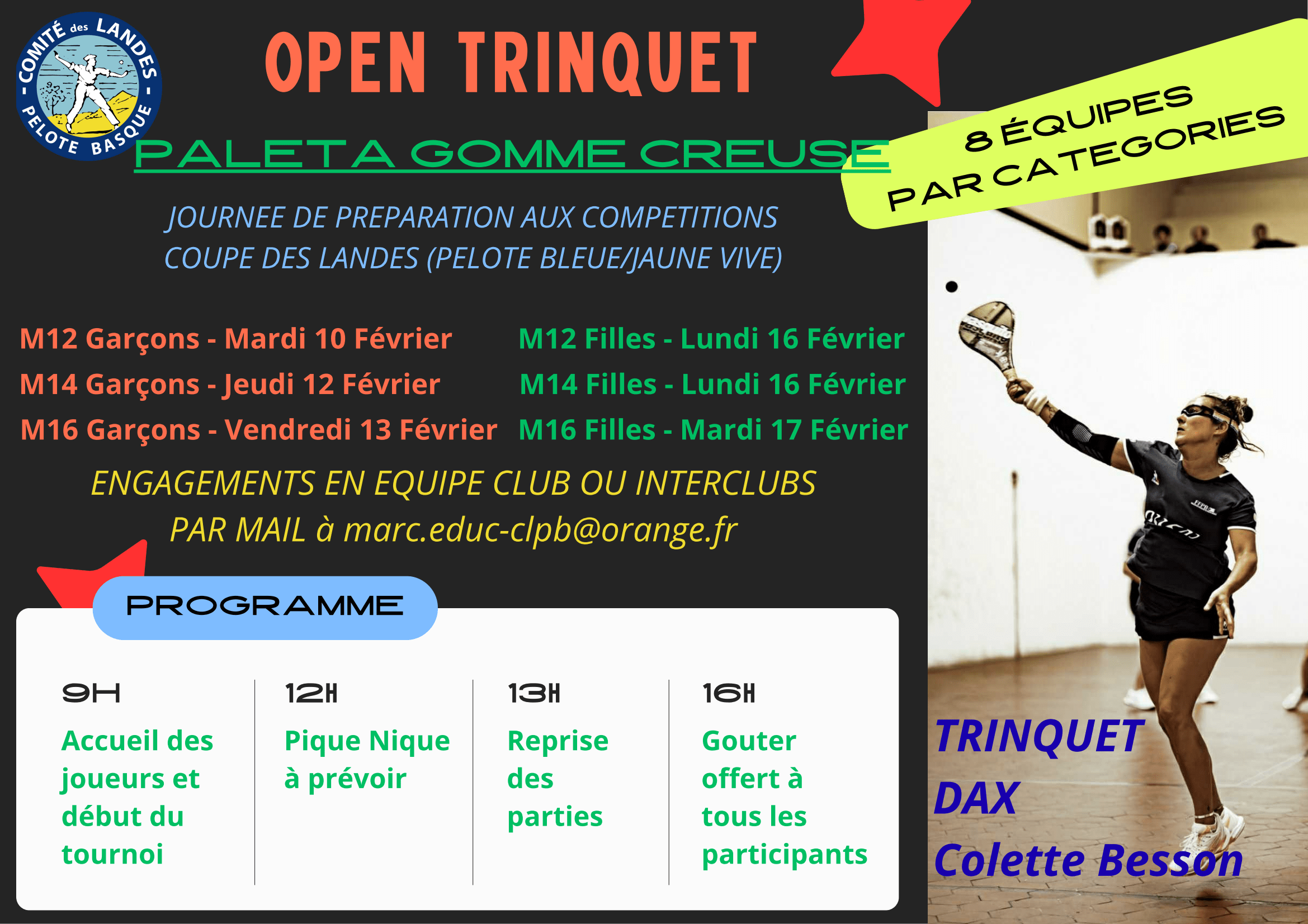 Dans le cadre de la préparation à la Coupe des Landes Trinquet Baline, le Comité des Landes de Pelote Basque organise des journées de préparation sous forme de tournois, destinées aux catégories Filles et Garçons M12 à M16, durant les vacances de février.